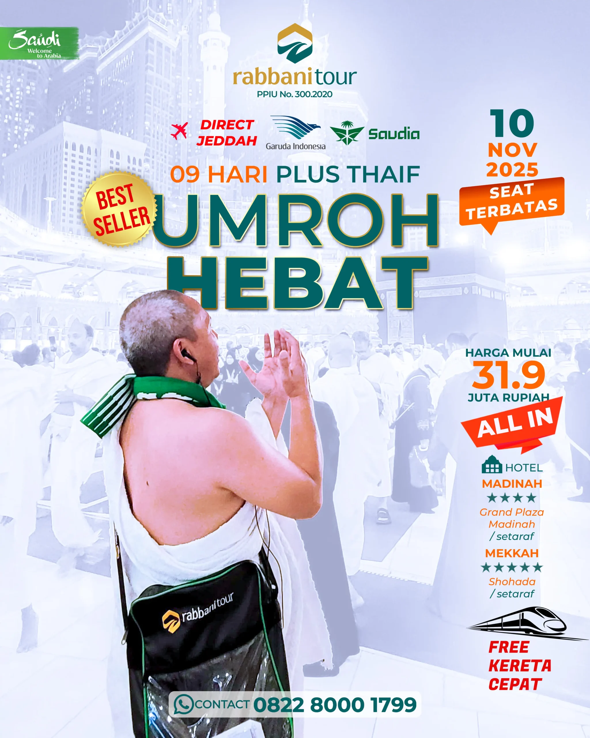Paket Umroh Hebat menawarkan pengalaman ibadah yang istimewa dengan fasilitas mewah, pendampingan spiritual, dan pelayanan 24/7. Dengan Hotel bintang lima, pendampingan oleh ustadz ahli, dan layanan tim yang siap membantu, Anda akan merasakan kenyamanan dan keberkahan selama perjalanan. Ini adalah pilihan terbaik untuk pengalaman umroh yang tak terlupakan dan mendalam di Tanah Suci.